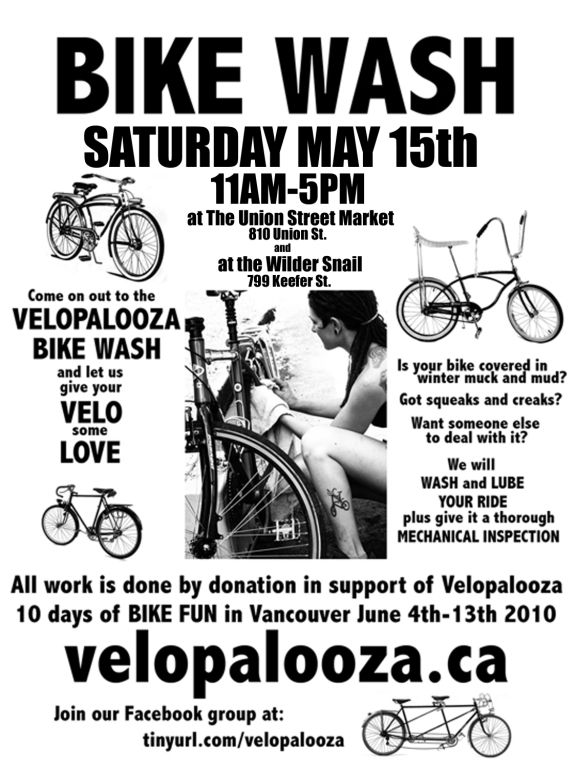 By: VelopaloozaIs your bike covered in muck and mud? Got squeaks and creaks? Want someone else to deal with it? Come on out to the Velopalooza bike wash and let us give your velo some love. We'll wash and lube your bike, plus give it a thorough mechanical inspection. If you're really feeling generous, we can take care of minor tune-ups as well. There will also be baked goodies and refreshments!
