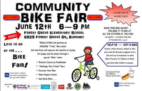 Community Bike FairFriday, June 12, 2015, 6:00pm - 9:00pm Meet At:Forest Grove Elementary School8525 Forest Grove Drive, BurnabyContact Info:twitter.com/VanCycleChic... Share: By: OrganizerBurnaby peeps, bring the family and check this event out. Don't have a bike? It's ok -- you can win one! < Previous5:30pmBBQ on Kits BeachNext >8:00pmVelopalooza Kickoff Ride