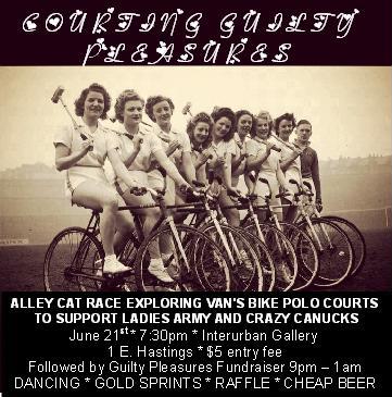 By: Lisa MoffattAn alley cat race exploring the history of bike polo and the courts it is/has been played on in Vancouver. This is followed by a fundraiser in support of the Ladies Army and Crazy Canucks polo which will include gold sprints, raffle, DJ, dancing, and cheap beer.