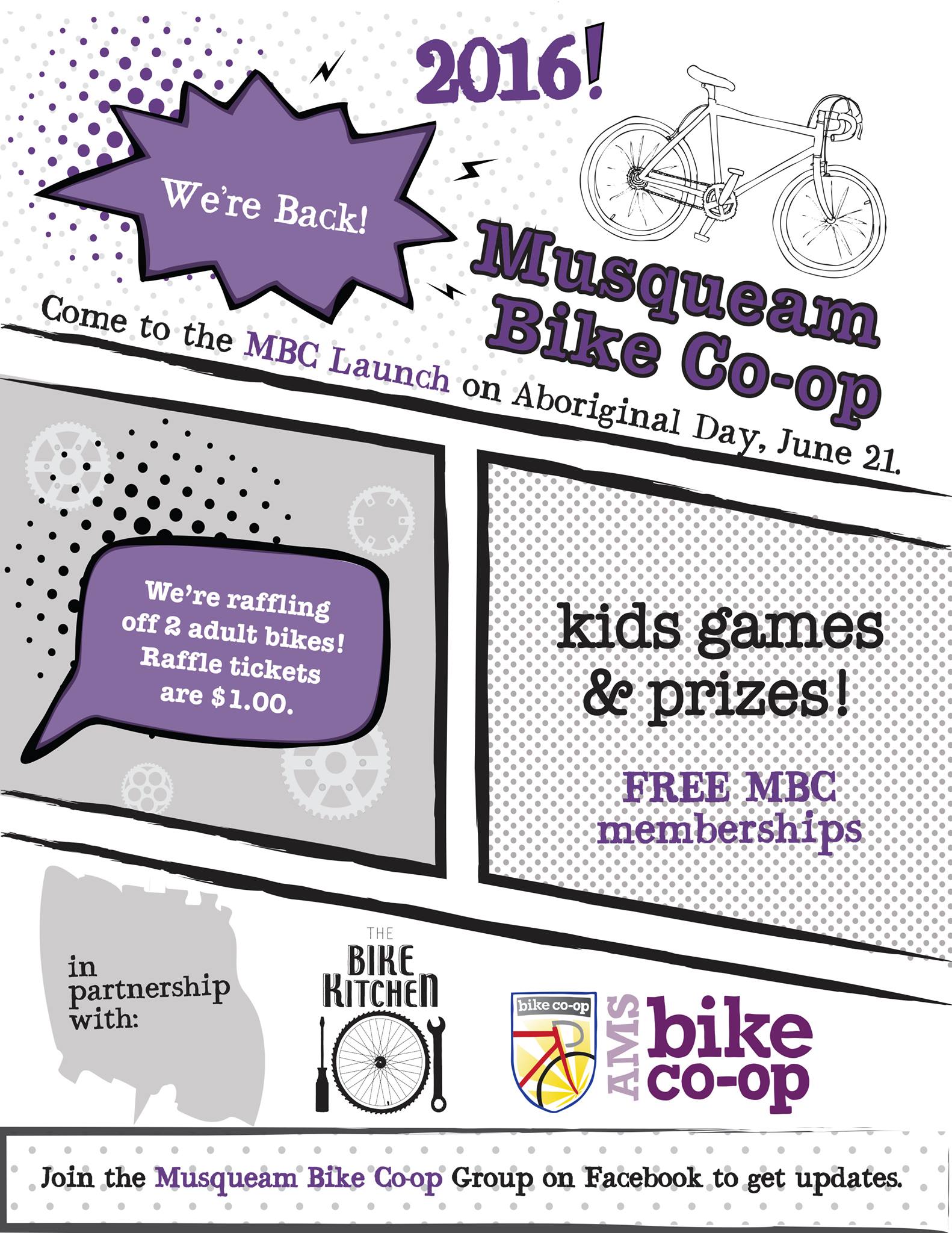 By: MBCThe 2016 Musqueam Bike Co-op (MBC) is launching for the summer on Aboriginal Day, June 21! We'll be playing games, giving away prizes and MBC memberships, and we are raffling off two adult bikes! Come by and get a membership, sign up to volunteer, and get raffle tickets! We will not be doing repairs or tune-ups for the launch. See you at the Aboriginal Day celebrations!