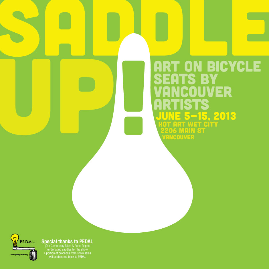 Just in time for Bike Month, ?Saddle Up!? is a group show featuring one-of-a-kind art on bicycle saddles. Local artists apply their work to a bike seat. Artists TBA. Interested in being in the show? If you?re a Vancouver-based artist, email a link to your portfolio to info