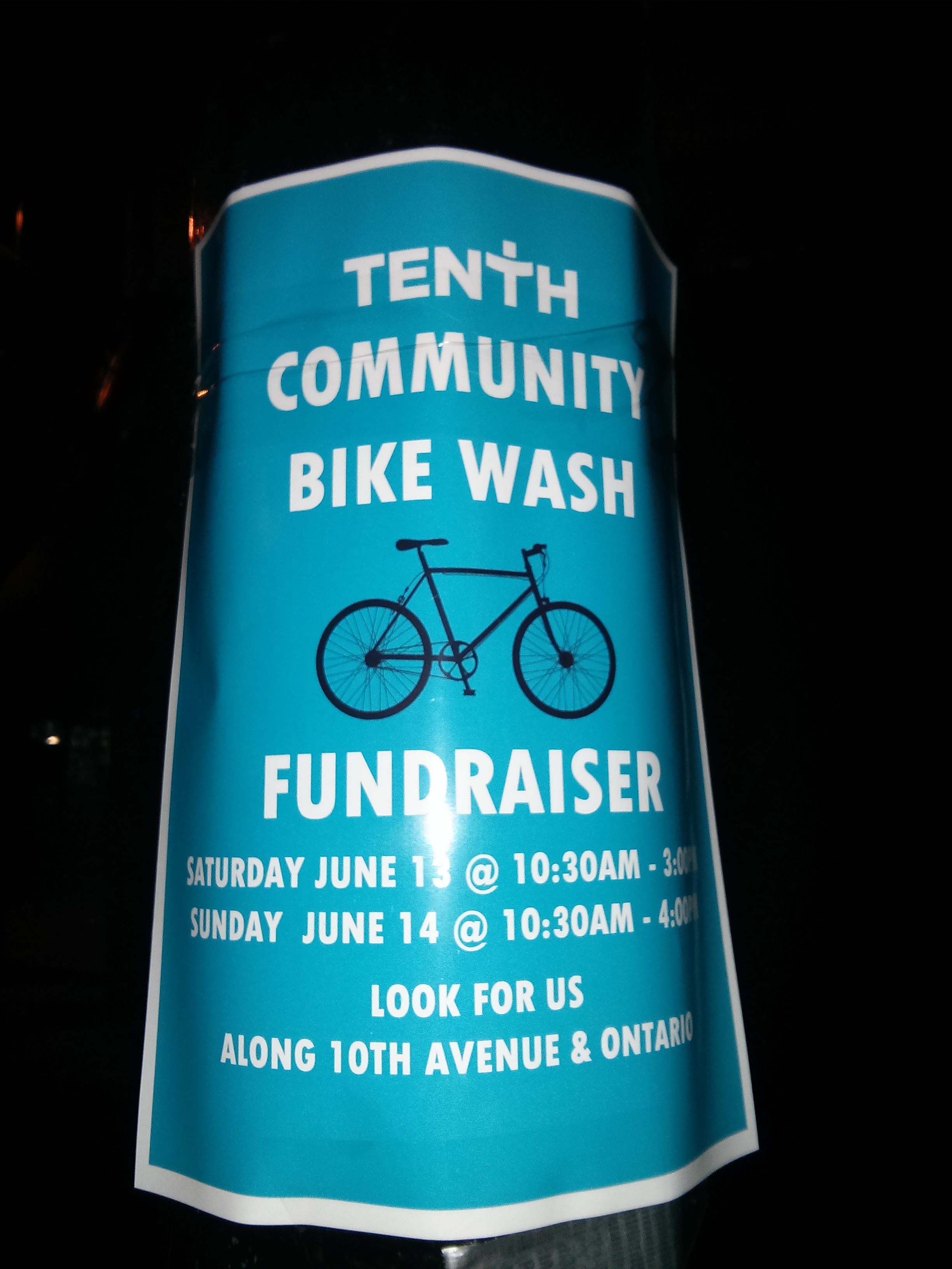 Tenth Community Bike Wash FundraiserSaturday, June 13, 2015 at 10:30am. Until 3:00pm on Saturday and 4:00pm on Sunday Repeats: June 13 - 14Meet At:0th Avenue and OntarioContact Info:e-mailtenth.ca604 876 2181 Share: By: Tenth CommunityA fundraising bike wash for the Tenth Church. Look for us along 10th Avenue and Ontario. < Previous10:00amHeron Ride & Picnic - YVRFamilyBikingNext >12:00pmRide the Road