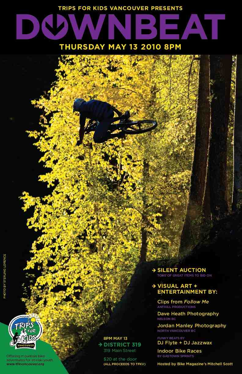 By: Fleurie HunterJoin Trips For Kids Vancouver (www.tfkvancouver.org) for an interactive social event showcasing video and still photography by local artists including Dave Heath, Jordan Manley, and the crew from Anthill Productions. All proceeds of the event directly support our 2010 spring and summer programs which will engage five hundred or more local youth in the experience of a lifetime - exploring our beautiful backyard by bike!