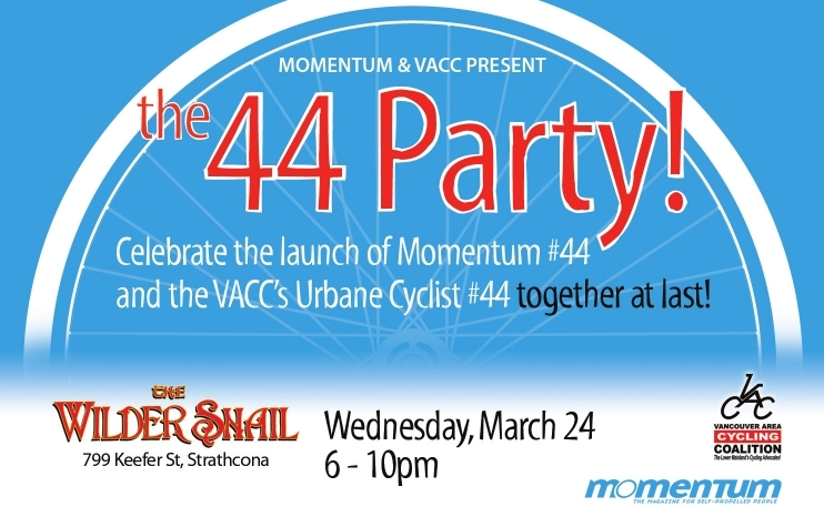 By: MomentumThe VACC newsletter, The Urbane Cyclist, has a new look and is now available as an insert in Momentum magazine. Join the Vancouver Area Cycling Coalition (VACC) and Momentum for the 44 Party! A launch party of Momentum #44 and VACC's Ubane Cyclist #44.